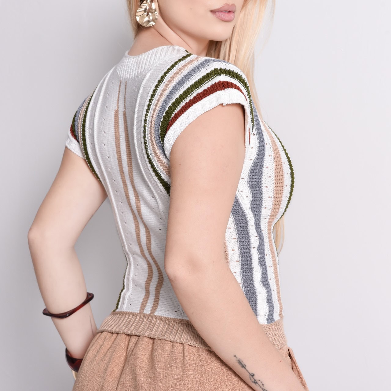 Tricot trabalhado com tramas vazadas e listras verticais