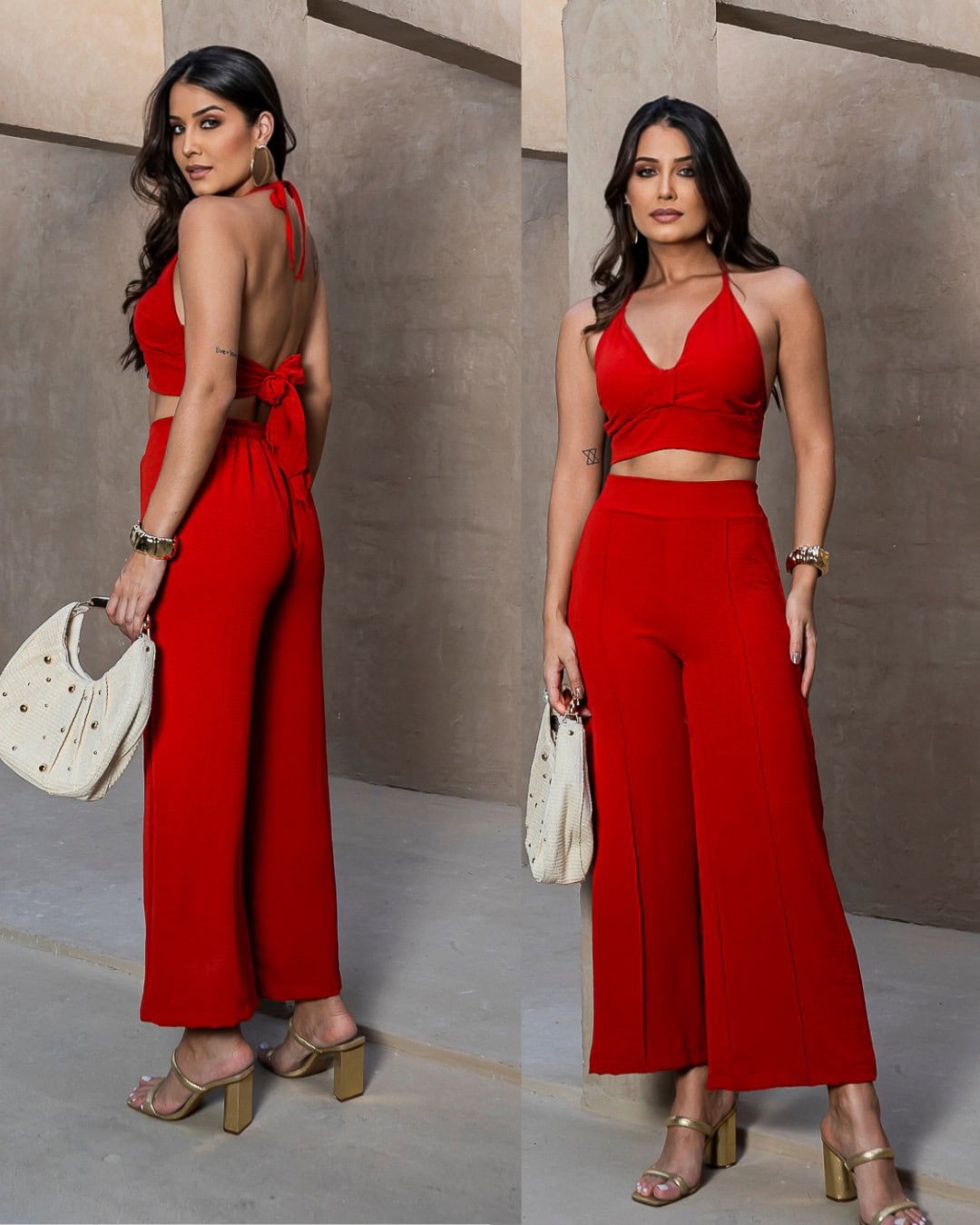 O conjunto conta com cropped frente única ajustável com amarração no pescoço e nas costas, trazendo um charme especial e garantindo melhor ajuste ao corpo. A calça pantalona com cintura alta e elástico posterior completa o look, unindo conforto e elegância.