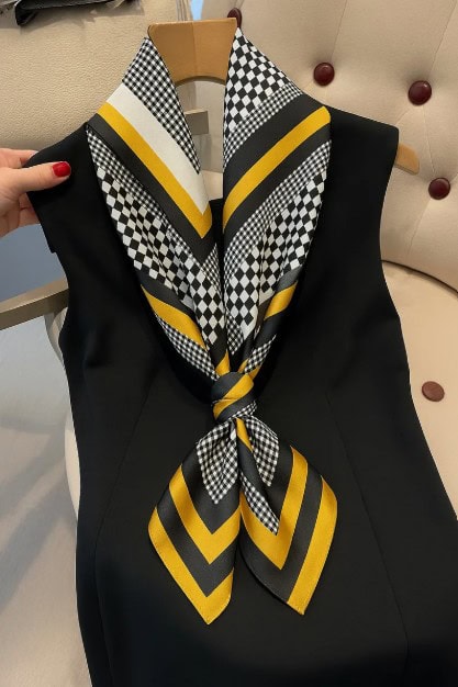 🔹 No pescoço – como echarpe, laço ou amarração clássica elegante.