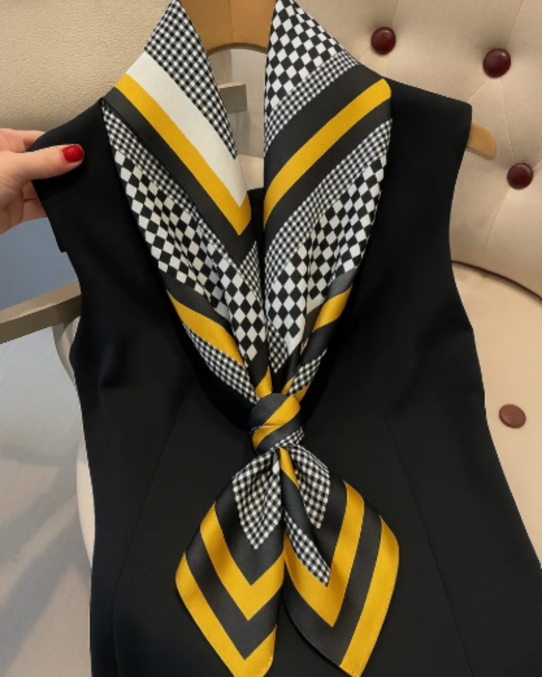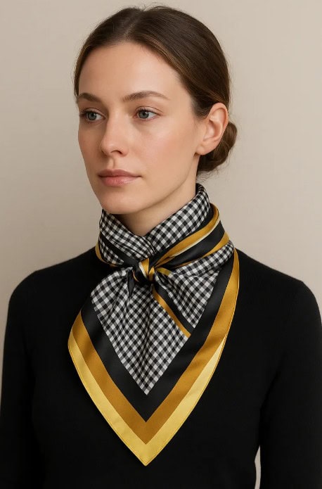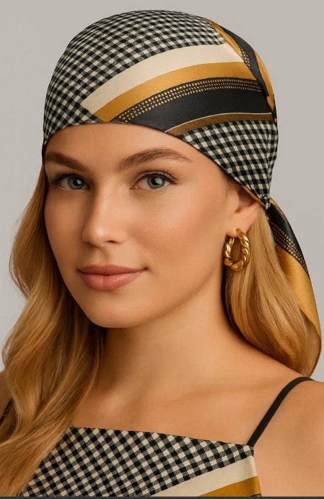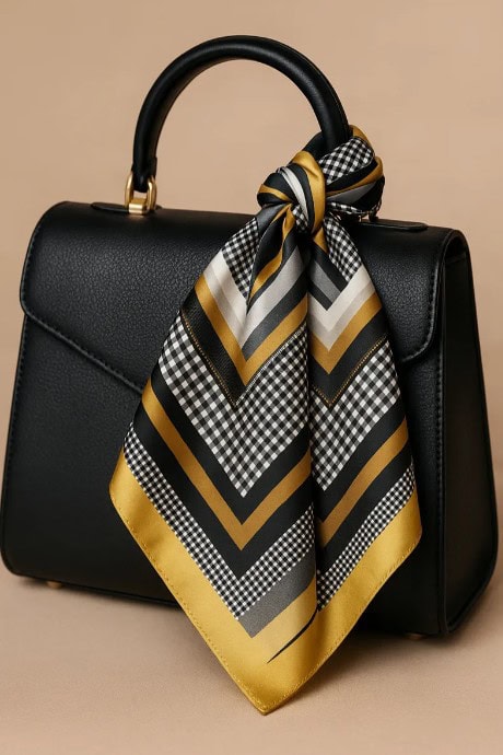 O Lenço de Cetim Estampado 90×90 é o acessório perfeito para elevar o estilo em qualquer ocasião. Produzido em cetim leve e acetinado, ele traz uma combinação sofisticada de cores – preto, branco e dourado – com estampa geométrica moderna que transmite personalidade e elegância.