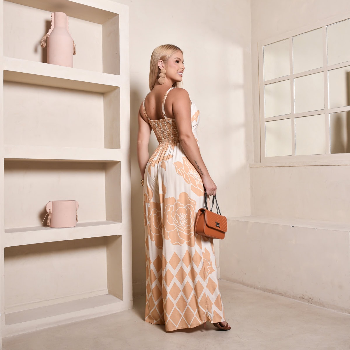 Macacão Pantalona Estampado Bege Feminino – Modelagem Elegante e Confortável