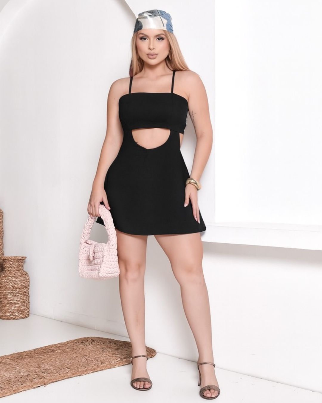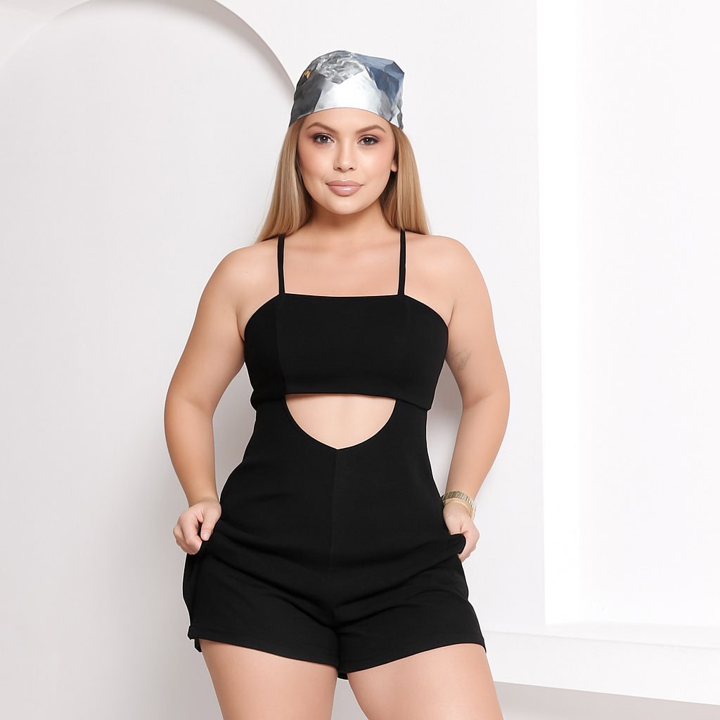 Esse Macaquinho Feminino Verão tem design moderno, com bojo embutido que valoriza o busto e recorte cut out na frente, criando um visual elegante e atual.