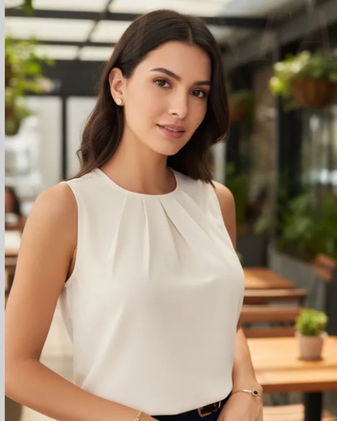 ✔ Modelagem: Regata com caimento fluido e pregas que valorizam o busto.
