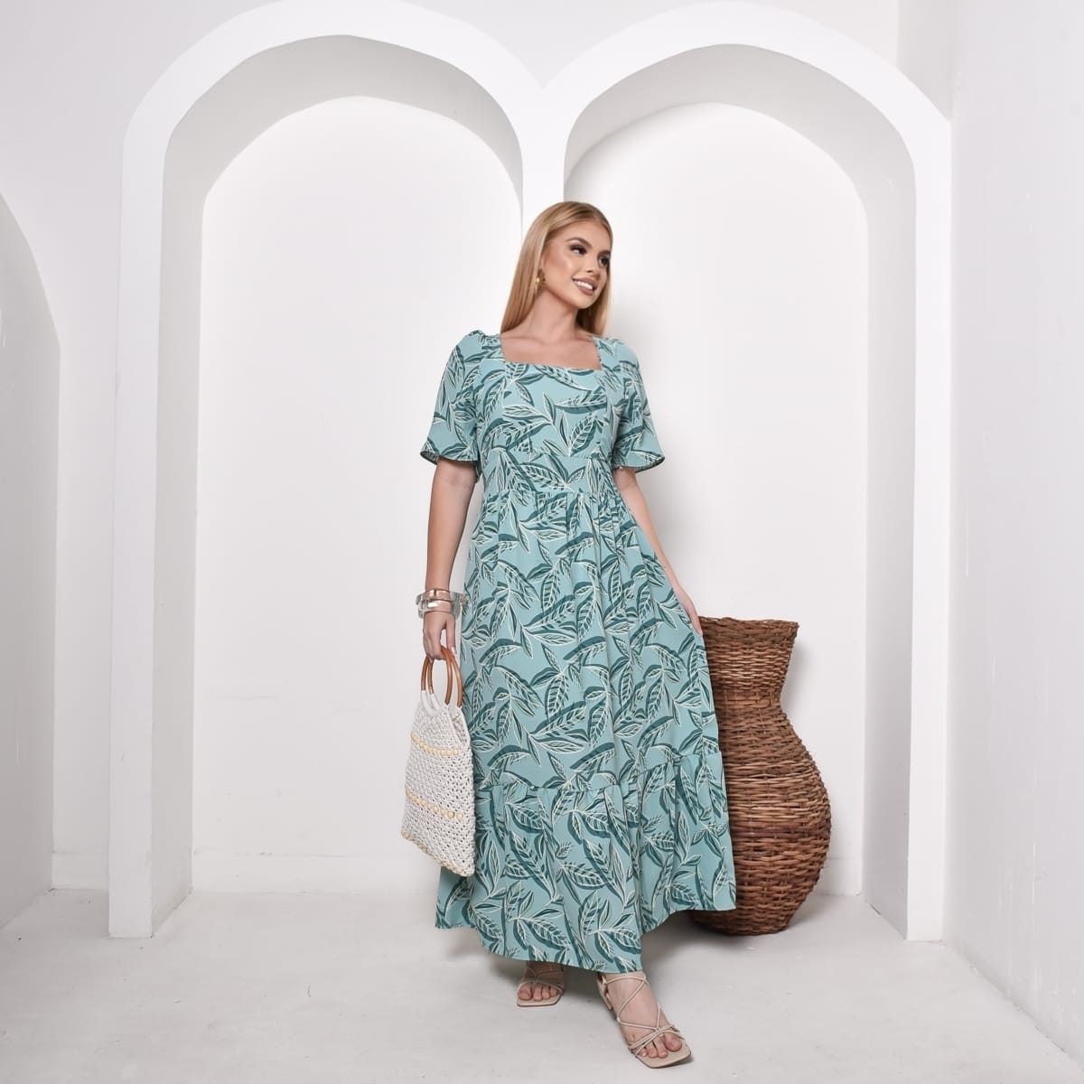 O modelo conta com decote quadrado, mangas soltinhas e costas com lastex, garantindo ajuste confortável ao corpo. A estampa folhagem em tons de verde transmite modernidade e leveza, enquanto o comprimento longo com recorte e babado traz fluidez e movimento ao visual.