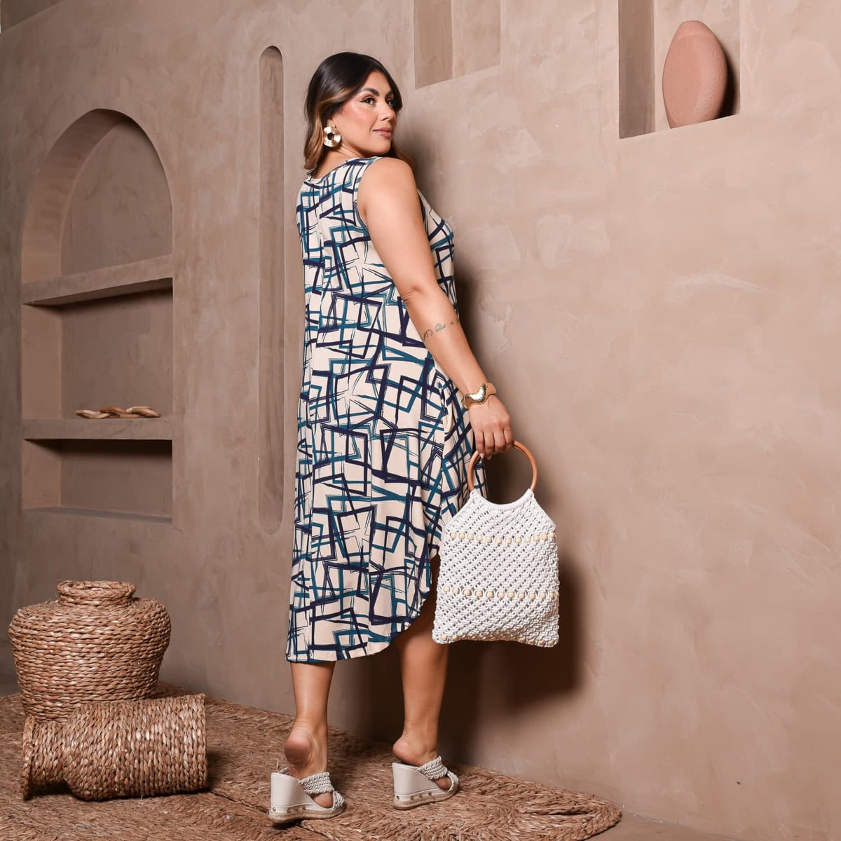 A estampa geométrica moderna deixa o look elegante e atual, podendo ser usado em diversas ocasiões – desde passeios casuais até momentos mais sofisticados.