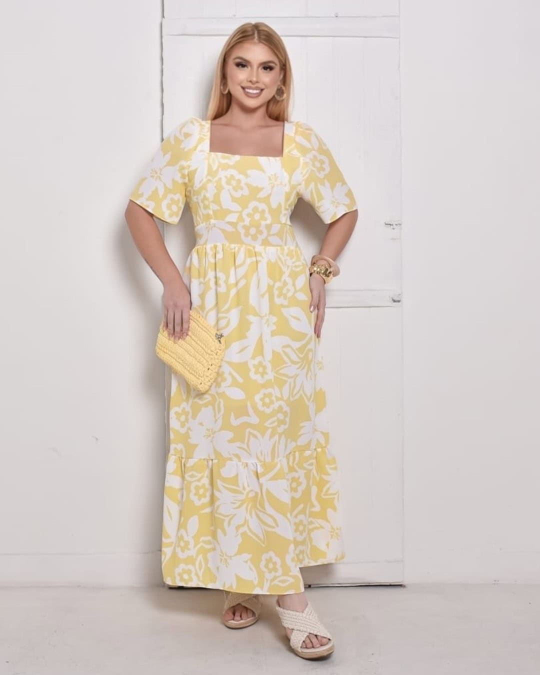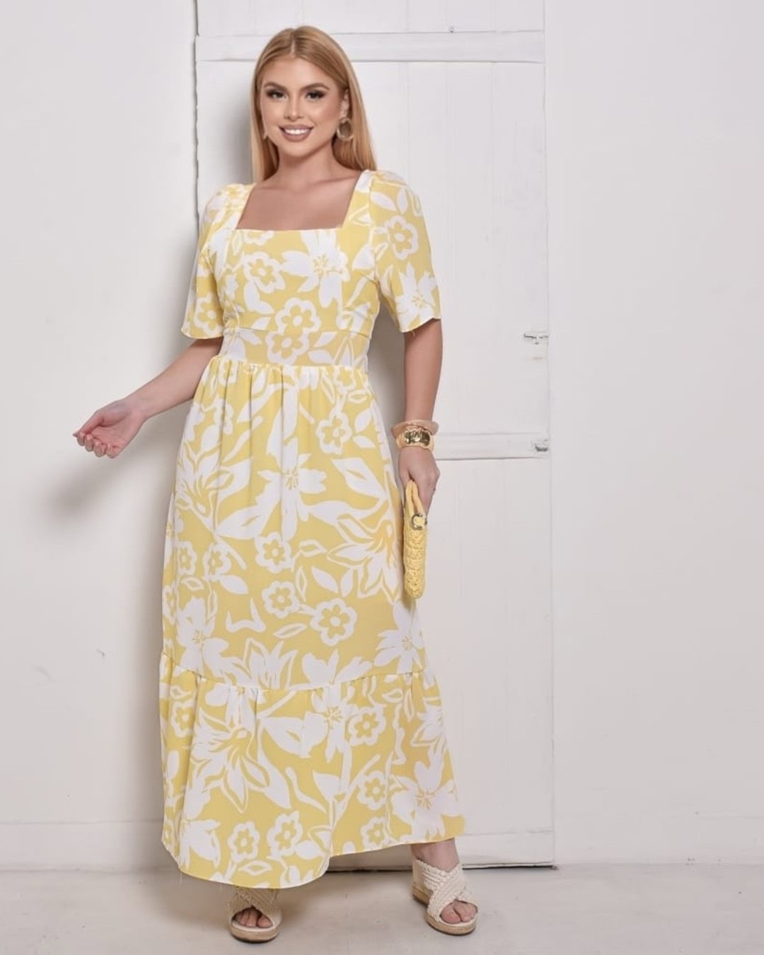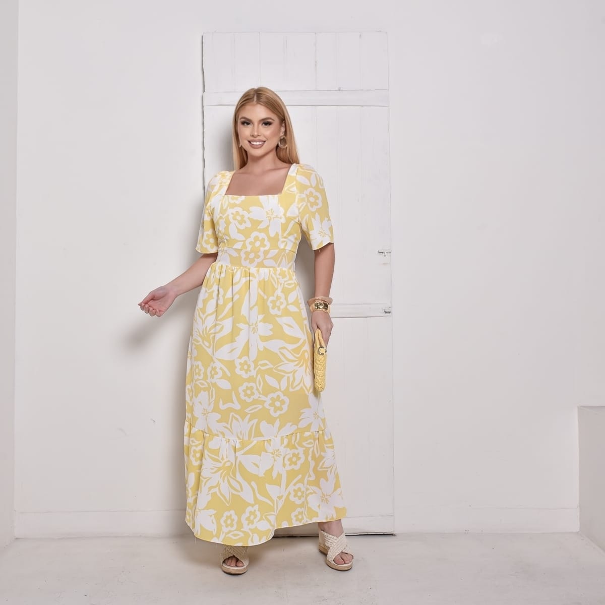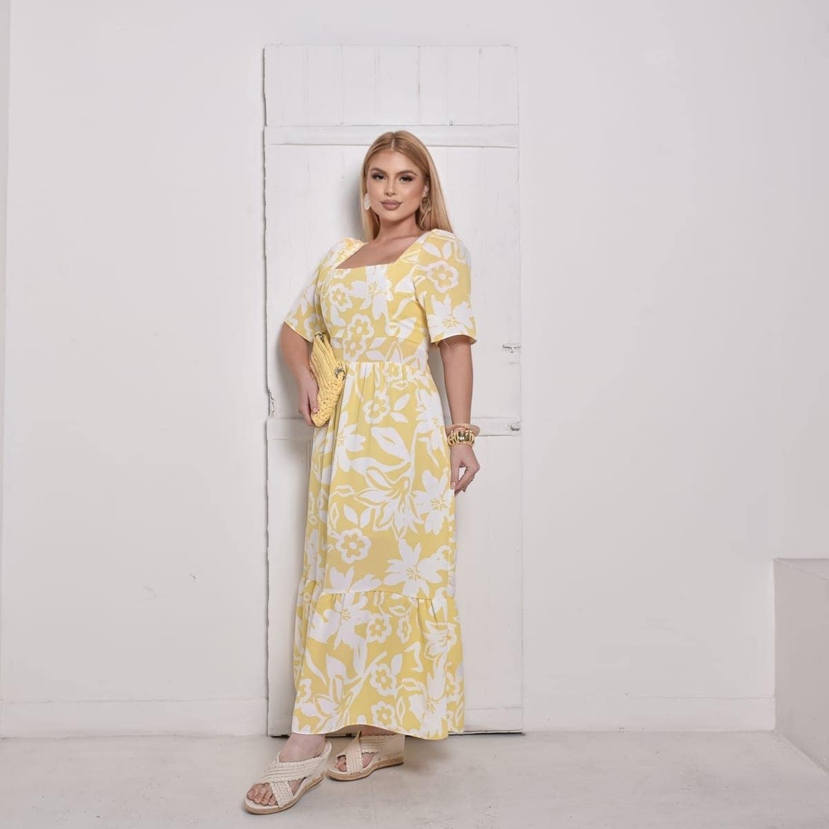 Com decote quadrado, mangas soltinhas e costas com lastex, ele se ajusta perfeitamente ao corpo, valorizando a silhueta com elegância. Sua estampa floral em branco sobre o fundo amarelo transmite alegria e delicadeza, tornando o vestido perfeito para diversas ocasiões. O comprimento longo com babado na barra garante fluidez e movimento ao visual.