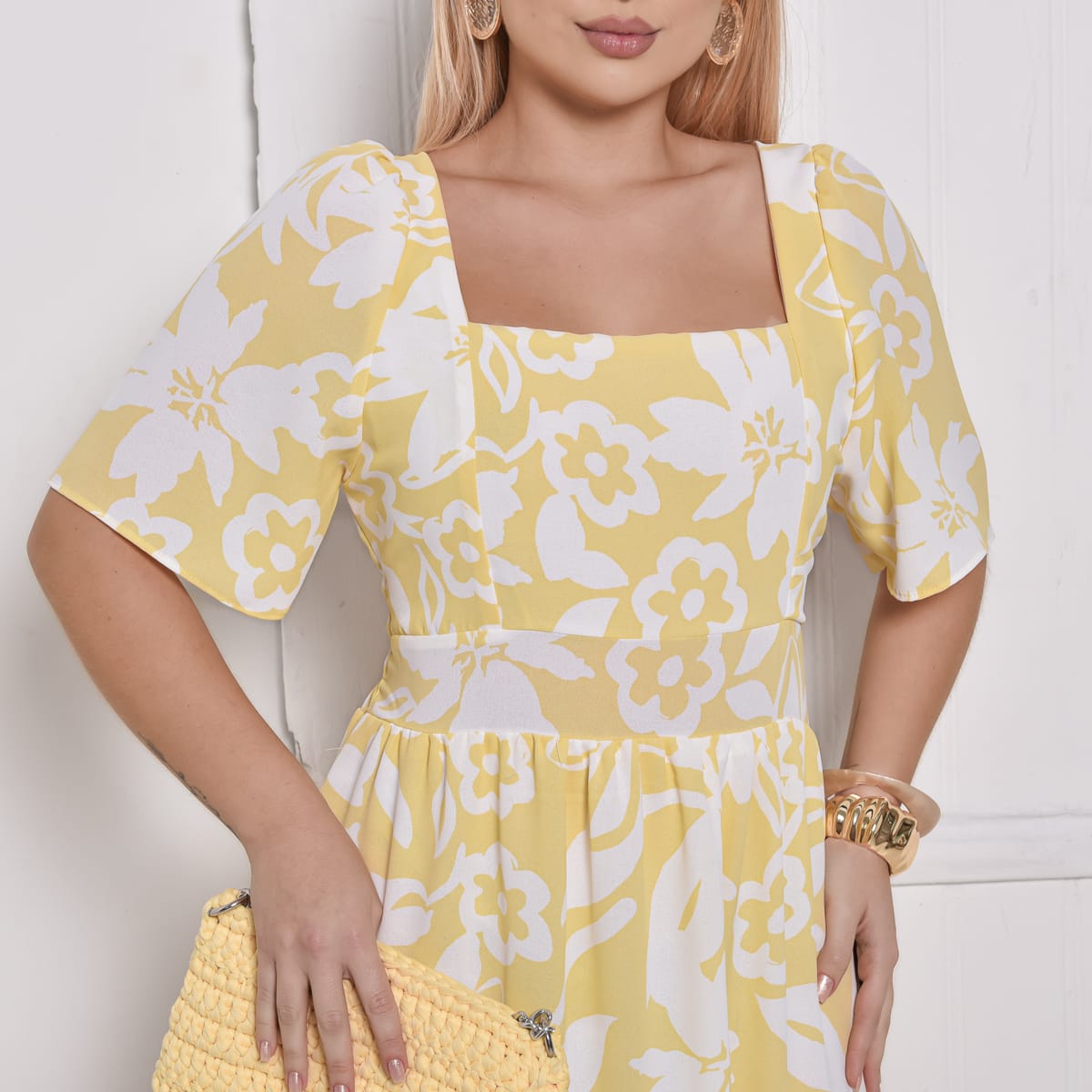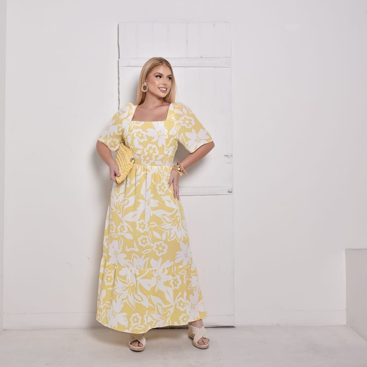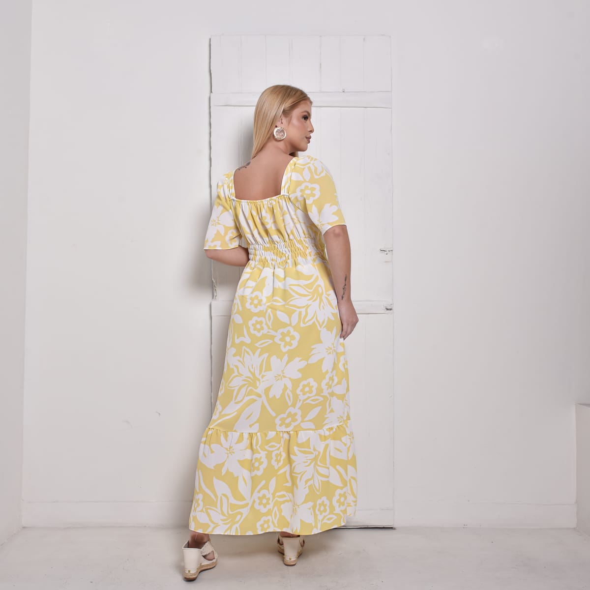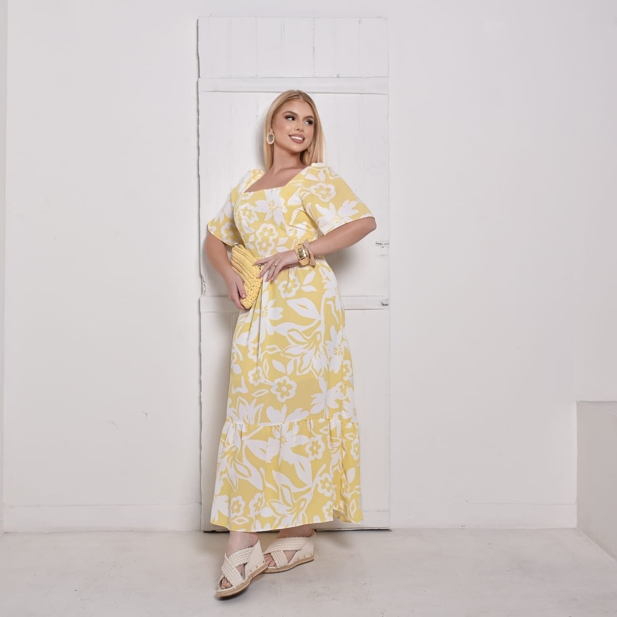 Com decote quadrado, mangas soltinhas e costas com lastex, ele se ajusta perfeitamente ao corpo, valorizando a silhueta com elegância. Sua estampa floral em branco sobre o fundo amarelo transmite alegria e delicadeza, tornando o vestido perfeito para diversas ocasiões. O comprimento longo com babado na barra garante fluidez e movimento ao visual.