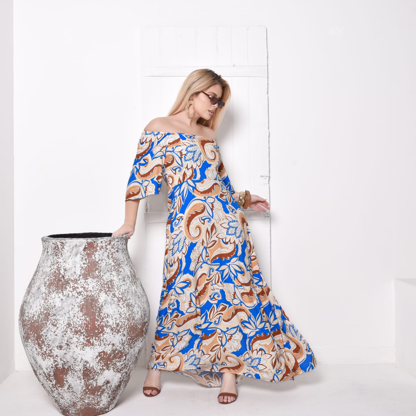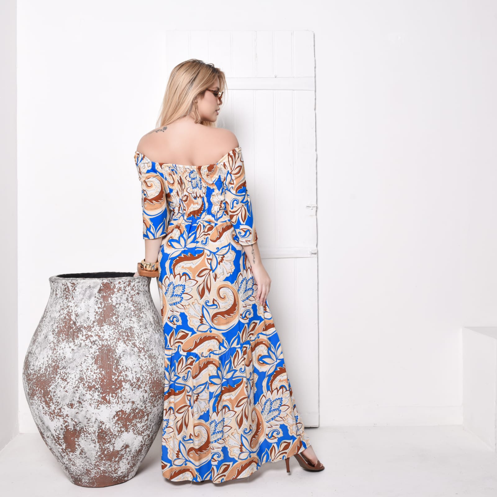 Vestido Longo Feminino Estampado Azul e Bege – Estilo, Conforto e Sofisticação