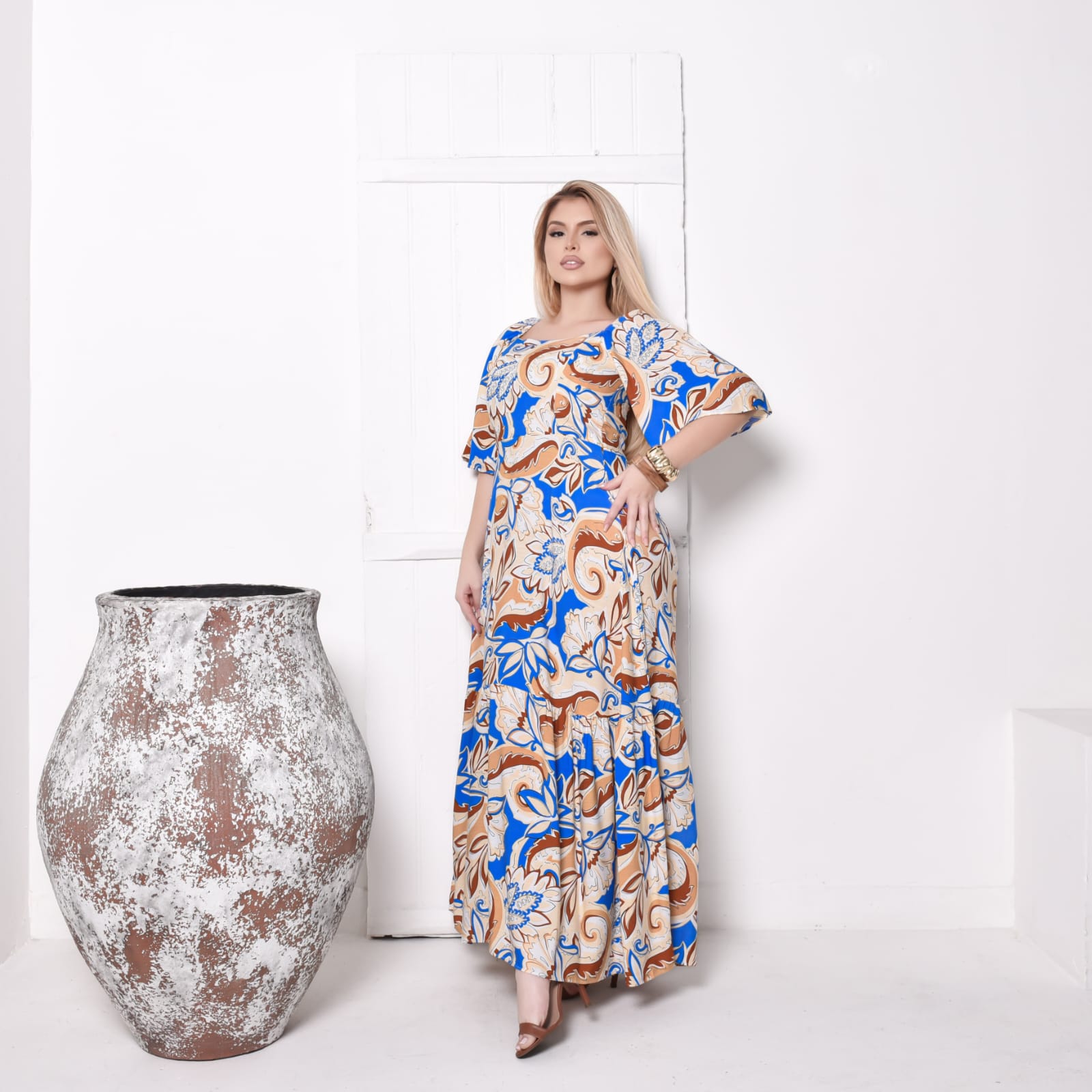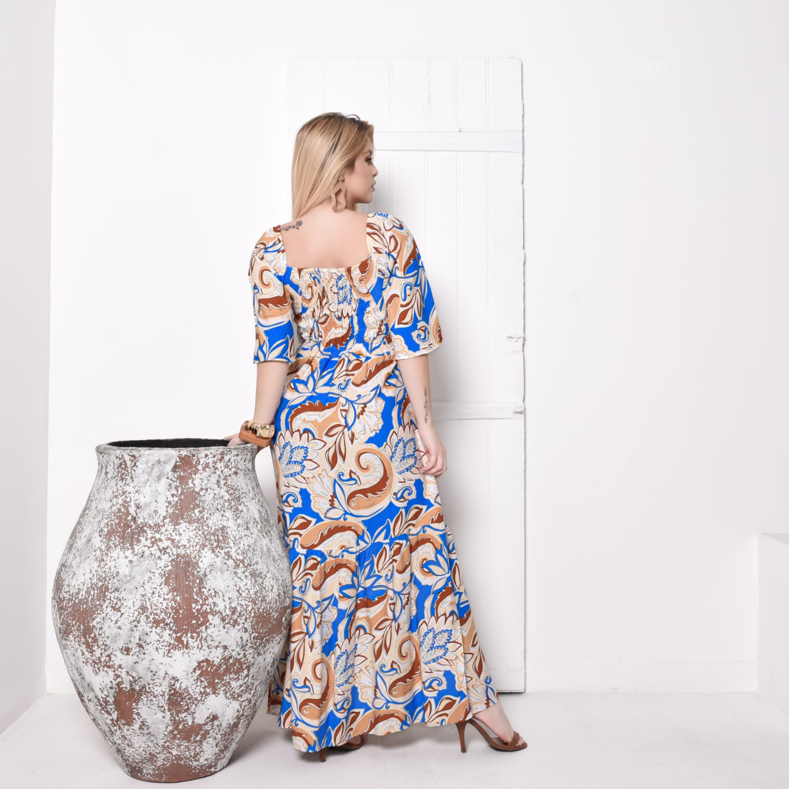 Com decote quadrado, mangas soltinhas e costas com lastex, o modelo proporciona ajuste ideal ao corpo. A estampa exclusiva em tons de azul, bege e marrom transmite modernidade e versatilidade, enquanto o comprimento longo com babado na barra traz movimento e sofisticação ao visual.