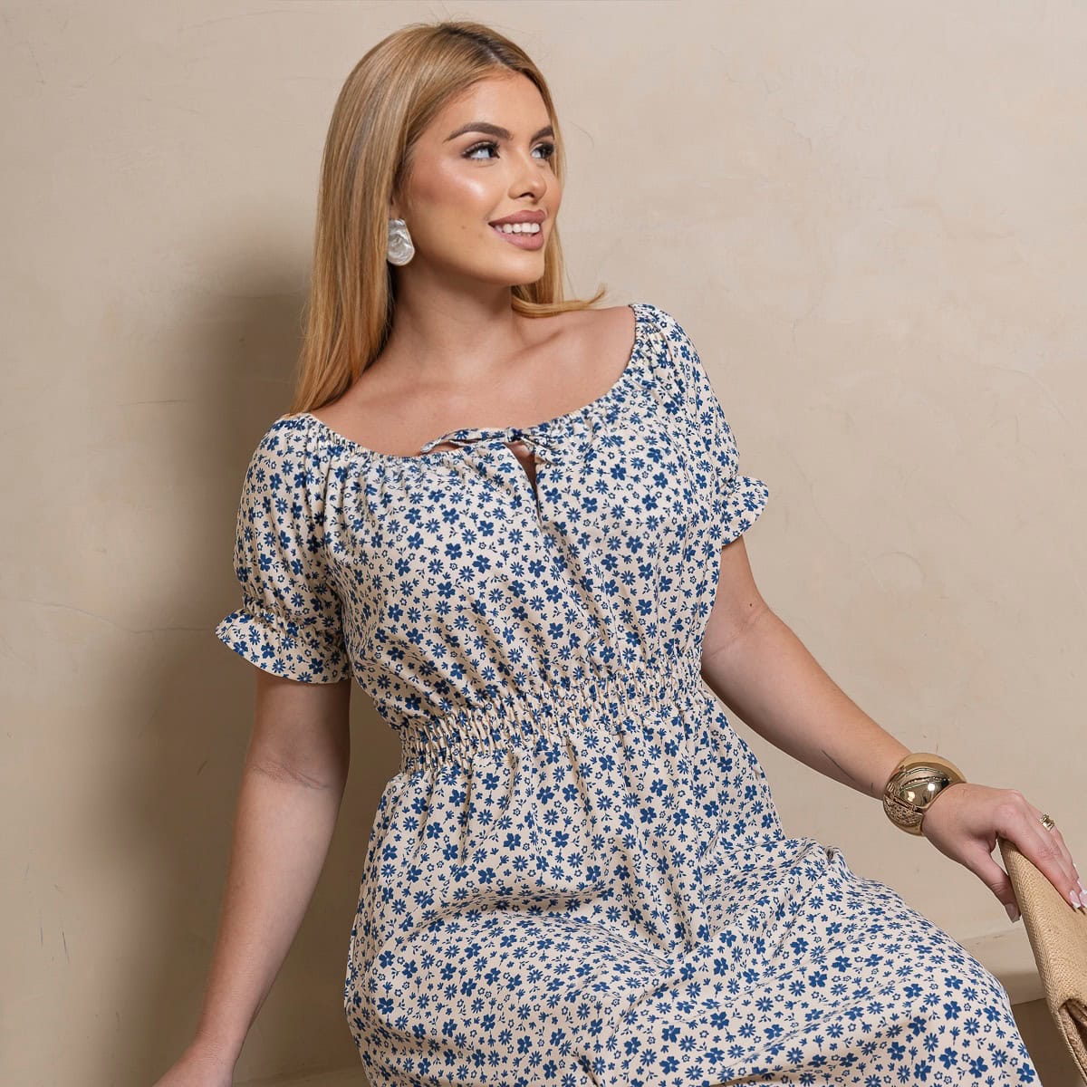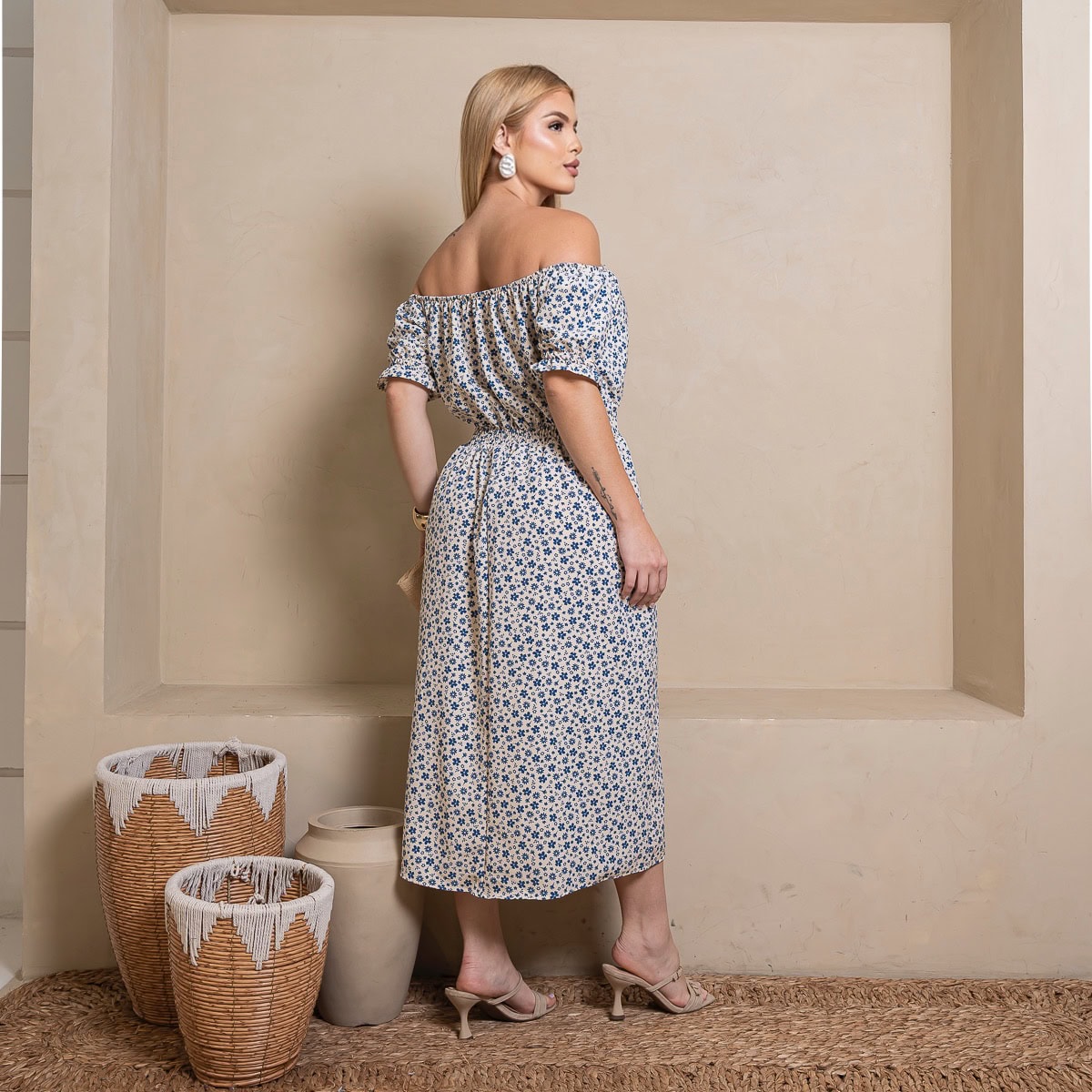 O decote ciganinha com elástico garante um visual moderno e delicado, deixando os ombros à mostra e trazendo feminilidade à produção. A estampa floral em tons suaves de azul traz um ar leve e sofisticado, ideal para os dias ensolarados e momentos especiais.
