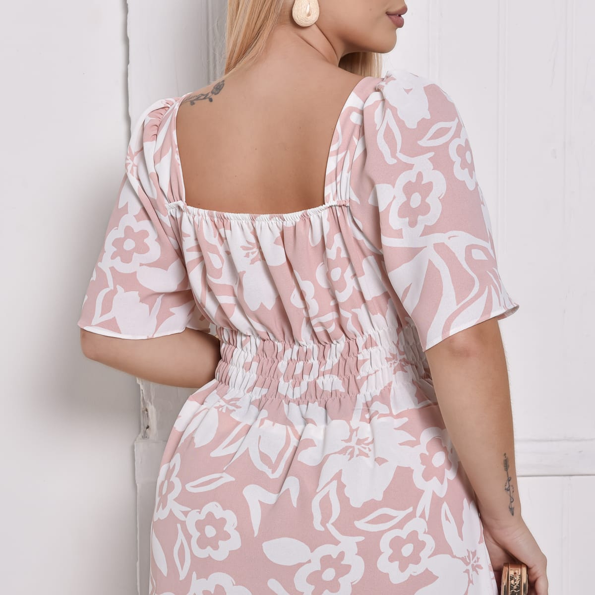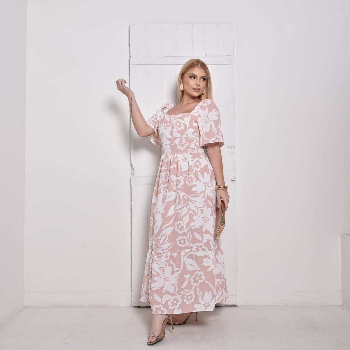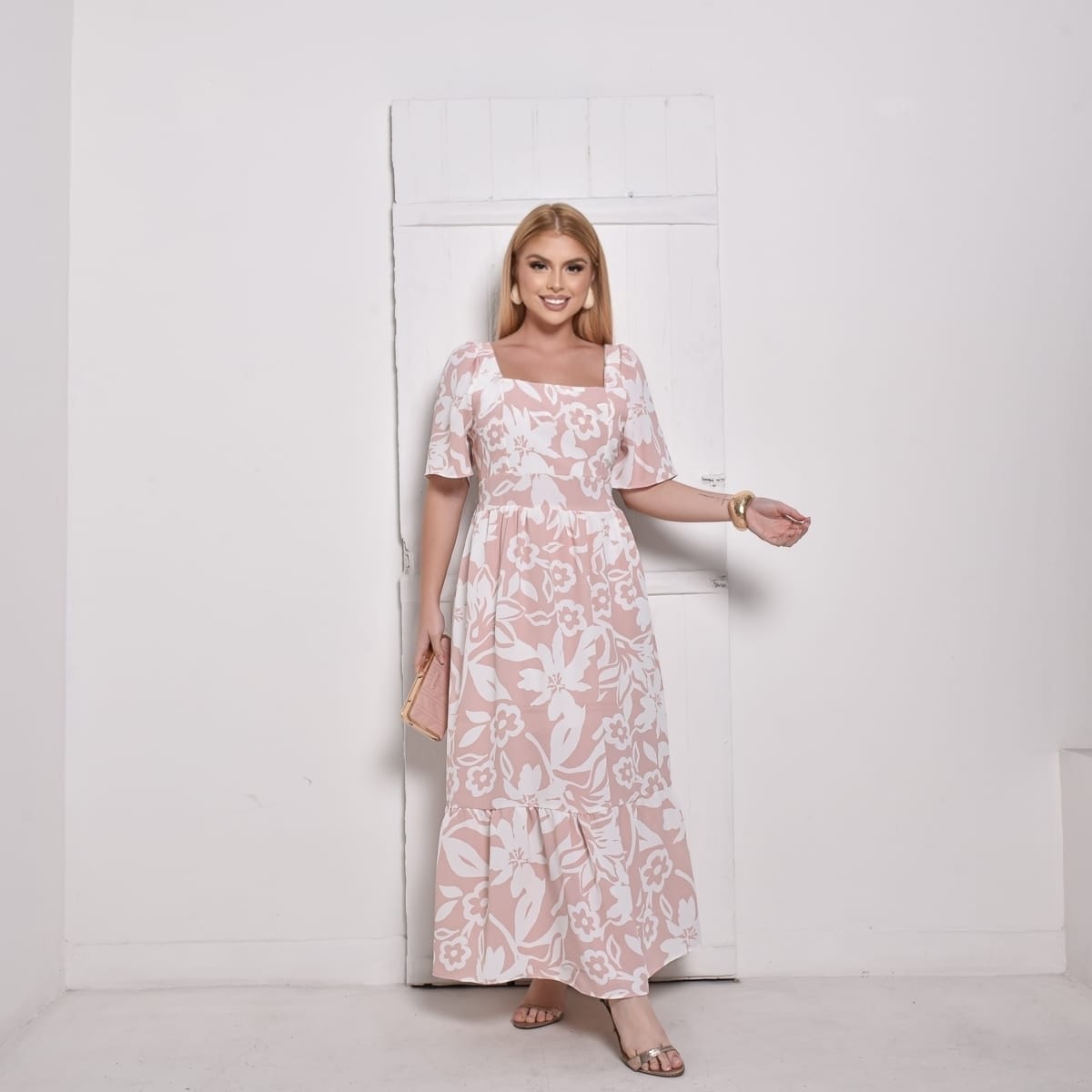 O modelo traz decote quadrado, mangas soltinhas e costas com lastex, garantindo um ajuste perfeito ao corpo com muito conforto. A estampa floral branca sobre o fundo rosé transmite feminilidade e sofisticação, enquanto o comprimento longo com babado na barra confere movimento e charme extra ao visual.