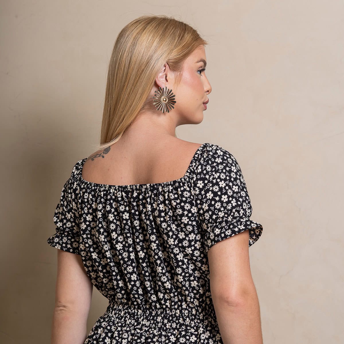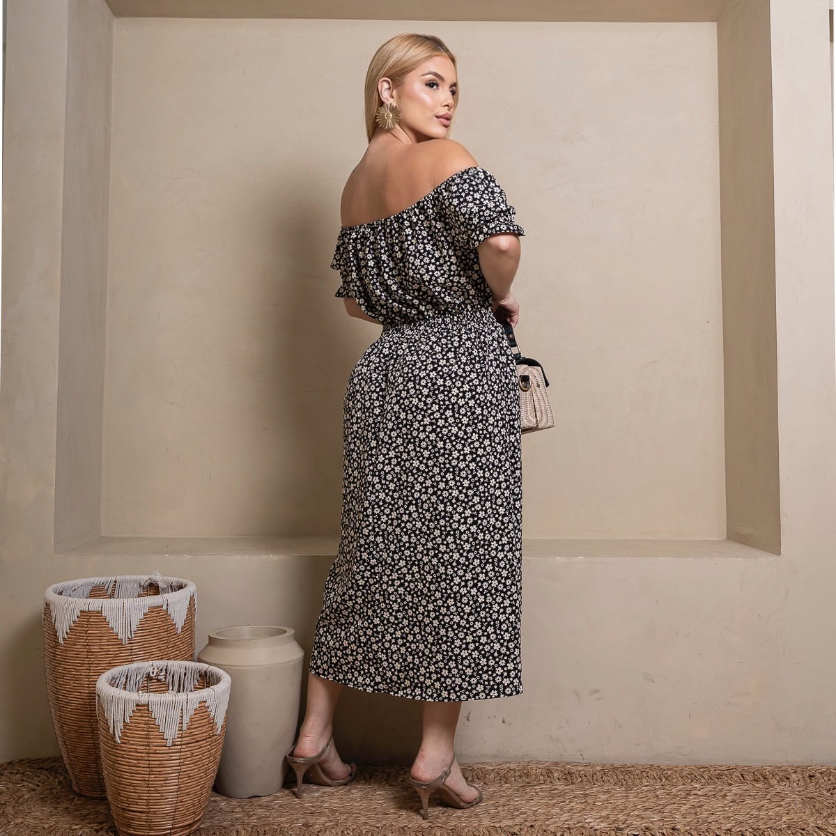 Com decote ciganinha e elástico nos ombros e na cintura, o vestido valoriza o corpo de forma leve e feminina, proporcionando um caimento perfeito. A estampa floral branca sobre o fundo preto cria um contraste sofisticado, tornando o look ideal tanto para o dia quanto para a noite.