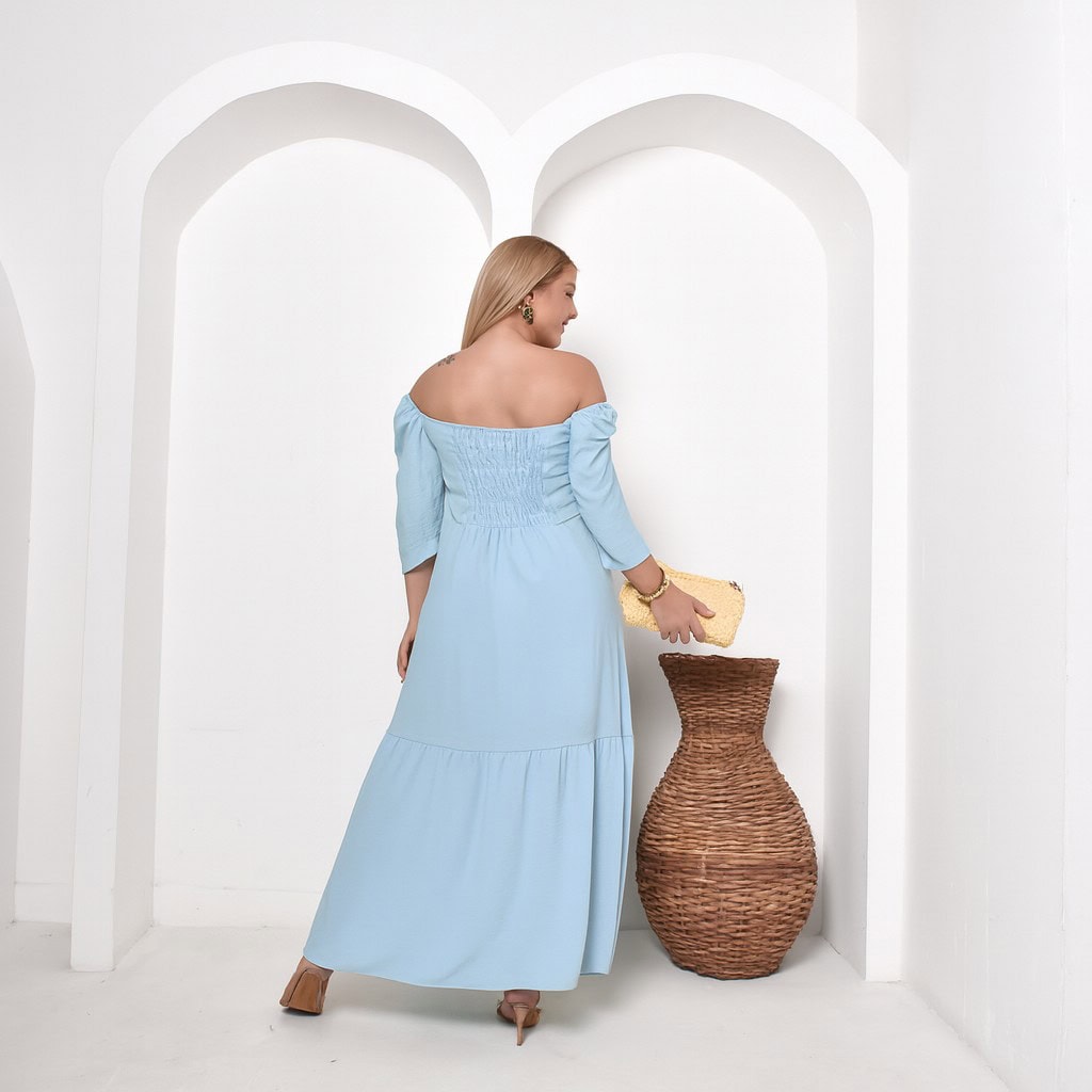 O vestido midi feminino azul claro é a escolha perfeita para quem busca uma peça moderna, elegante e versátil. Confeccionado em tecido viscolinho premium, oferece leveza, frescor e caimento impecável que valoriza a silhueta.