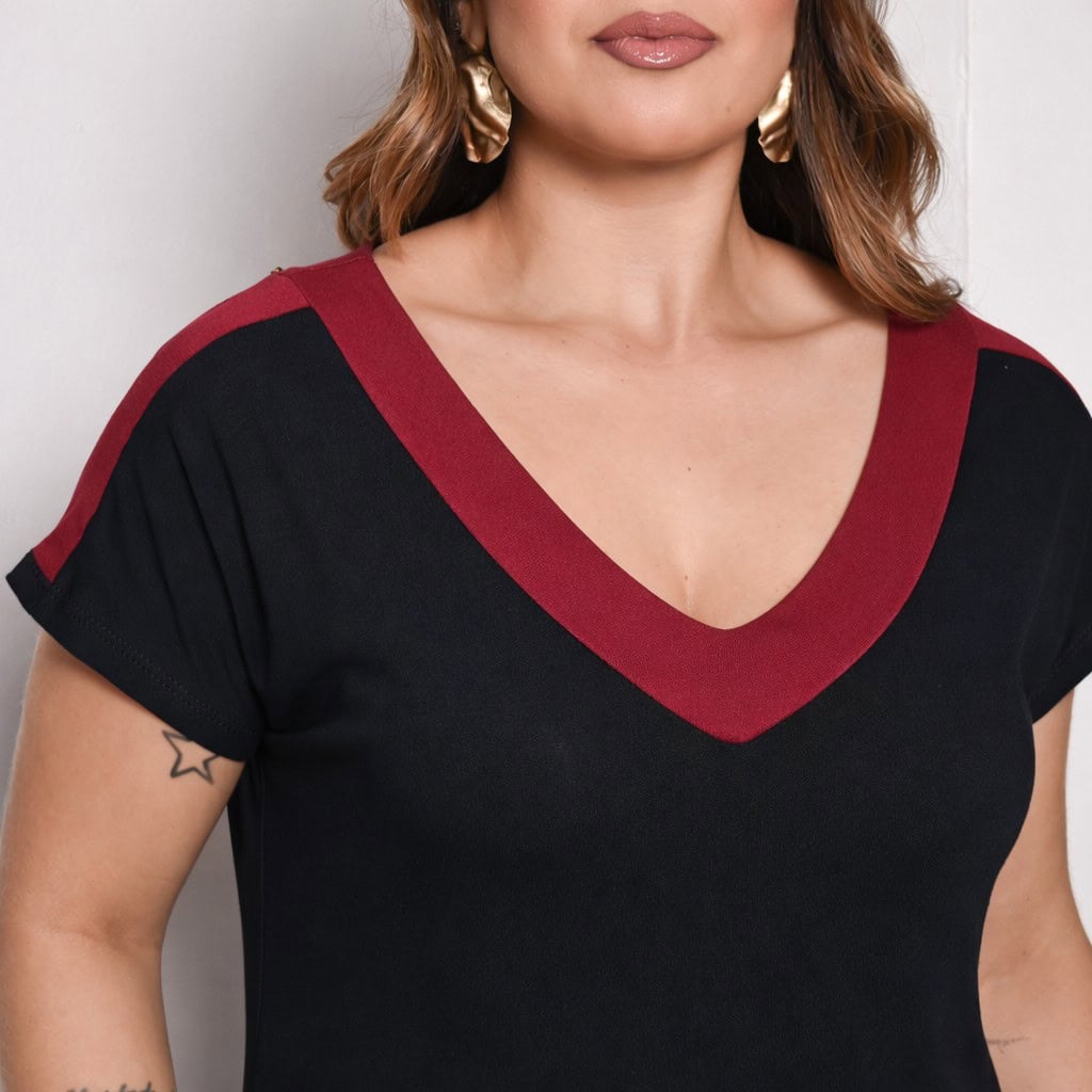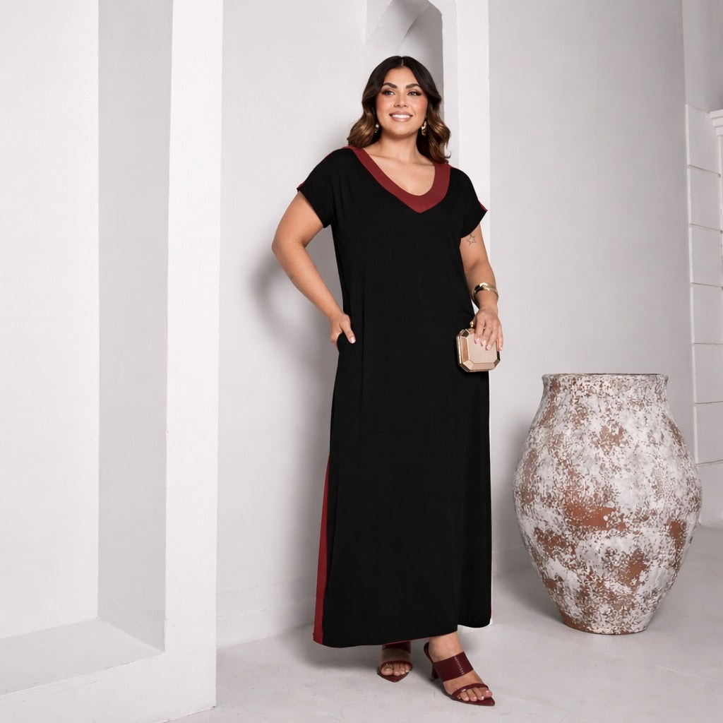 Confeccionado em viscolycra premium, o vestido longo feminino possui decote em V com detalhe contrastante, fenda lateral e bolsos funcionais, que unem charme e conforto.