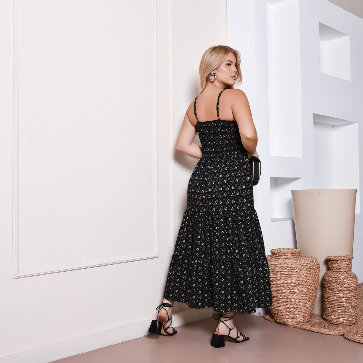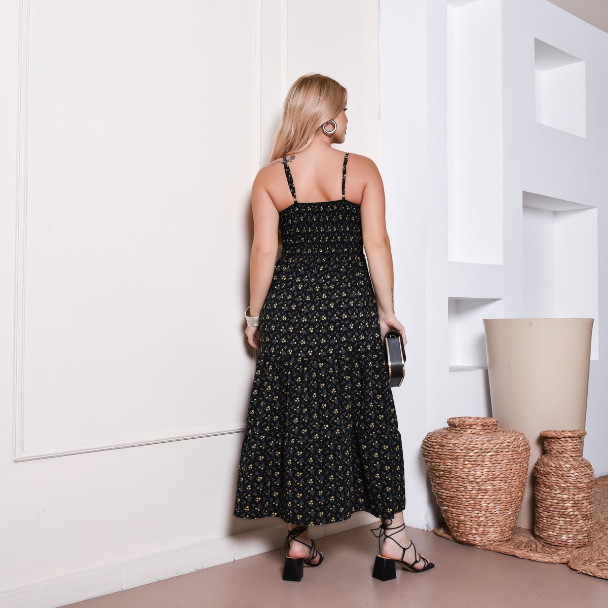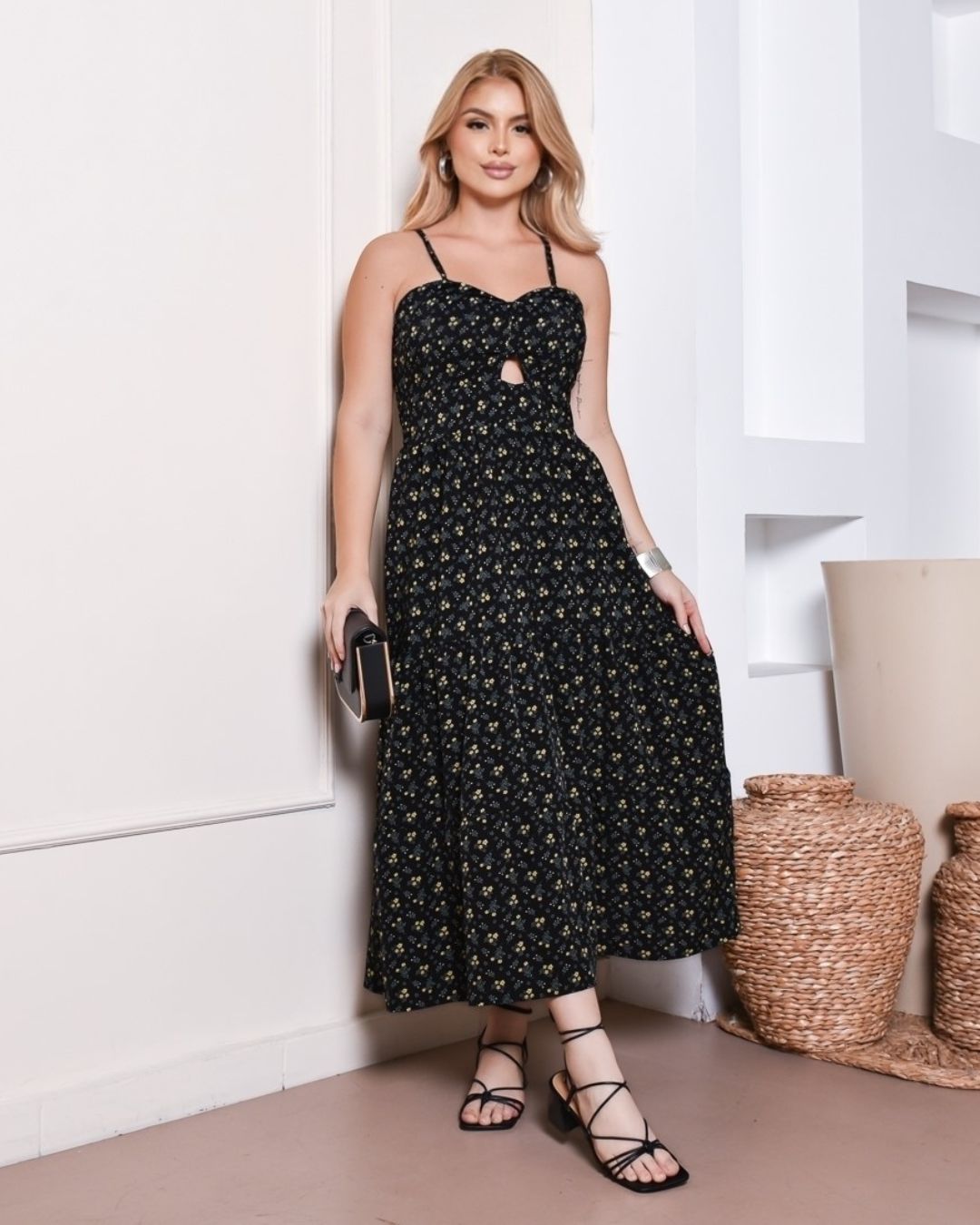 Praticidade: peça única que resolve o look com facilidade e estilo.🌸 Vestido Midi Estampado Alça Fina com Recorte Frontal