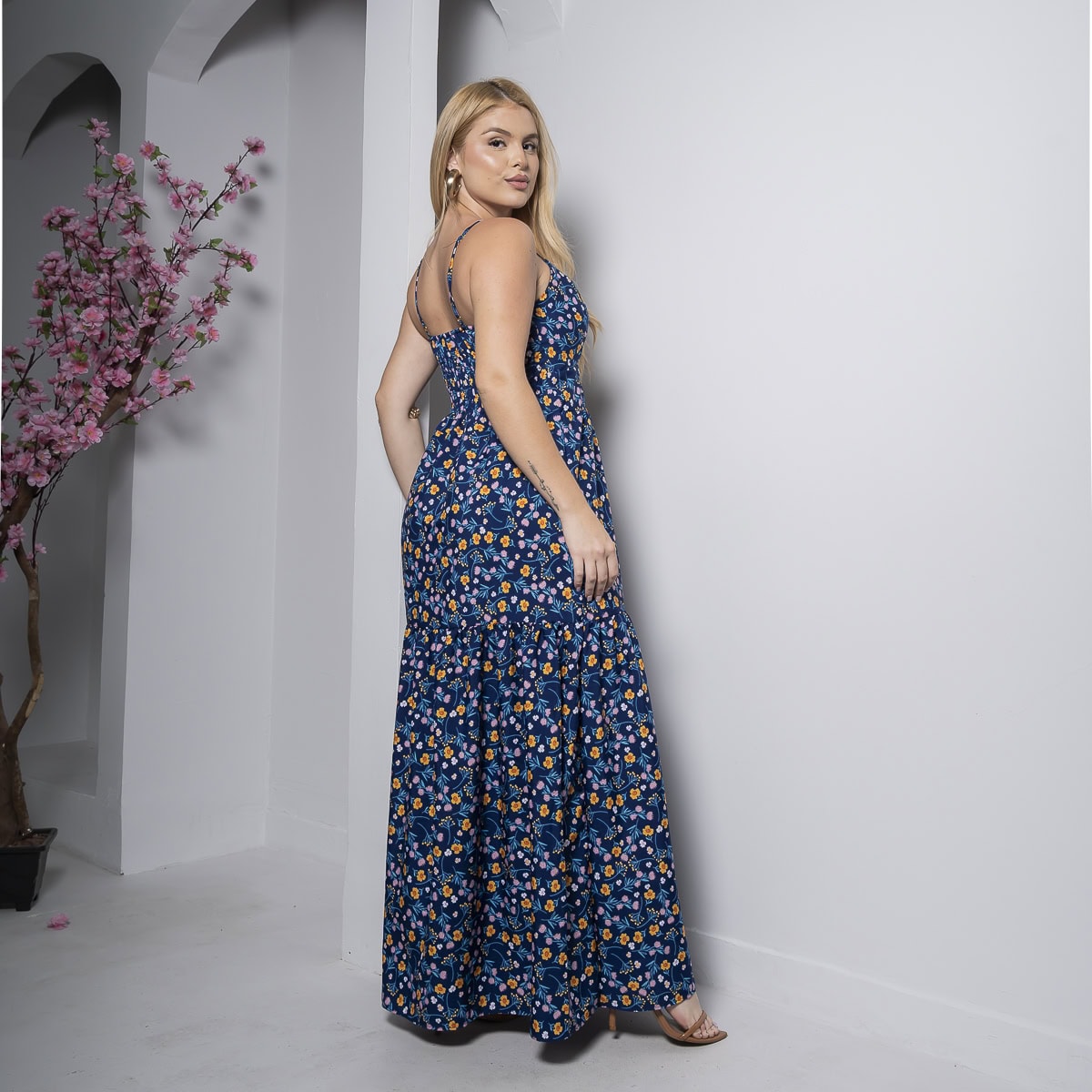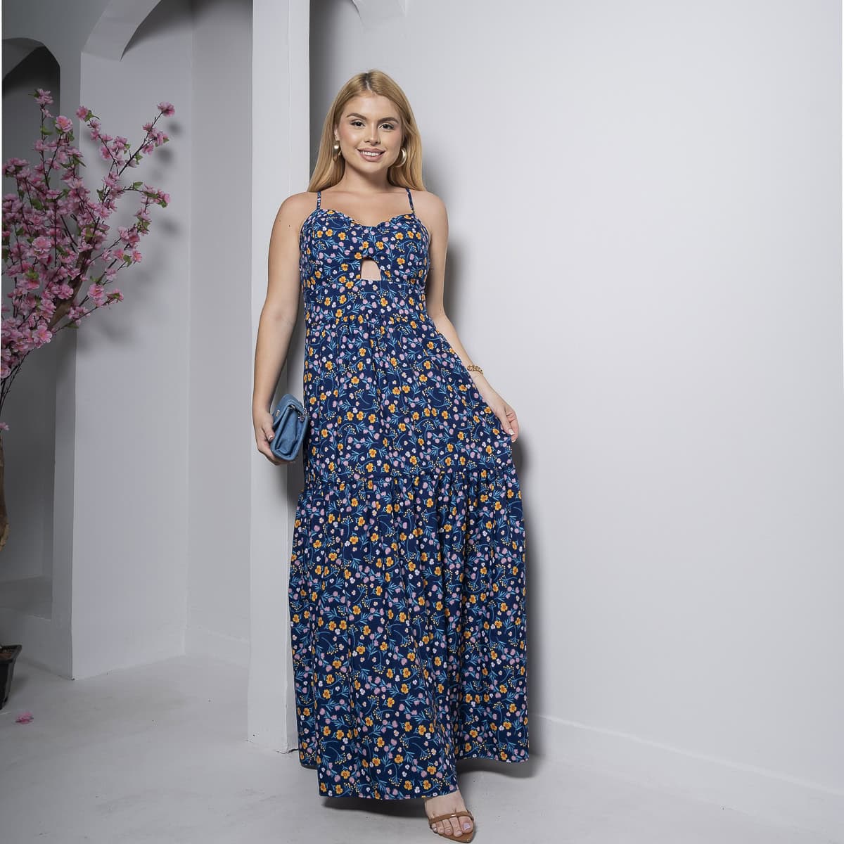 Esse vestido longo azul floral é a escolha ideal para quem busca conforto e feminilidade em uma única peça. Seu caimento fluido e o bojo embutido valorizam o corpo, enquanto a estampa delicada traz um toque romântico e moderno.