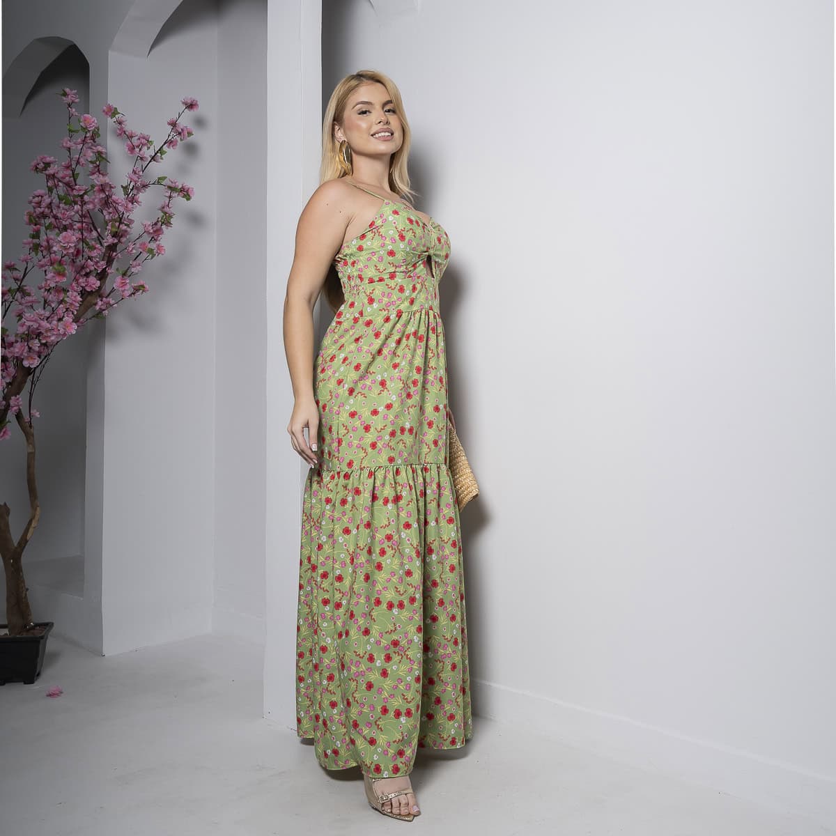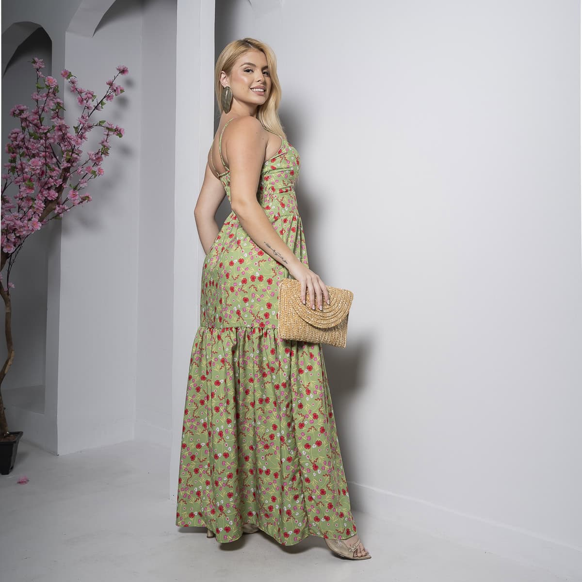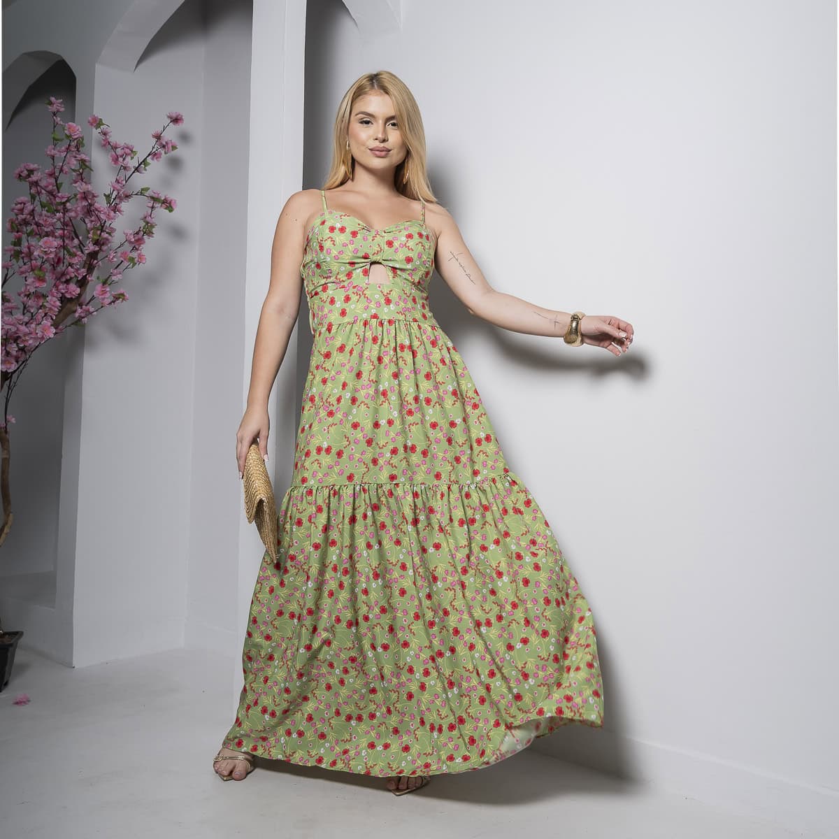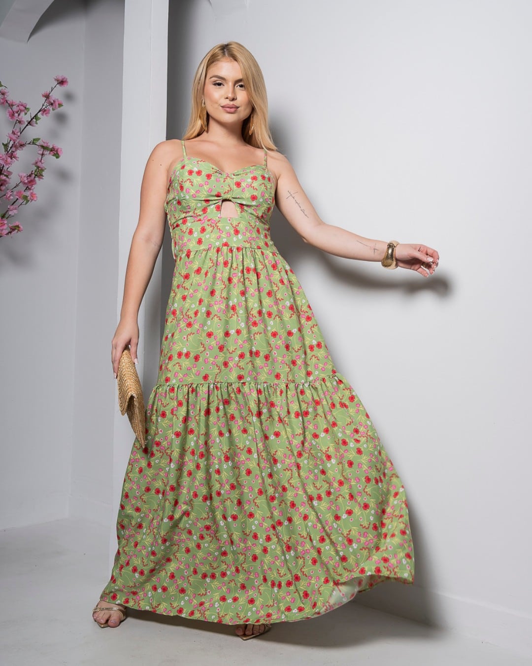 Vestido Longo Floral Verde com Bojo e Alças Finas – Tamanho Único