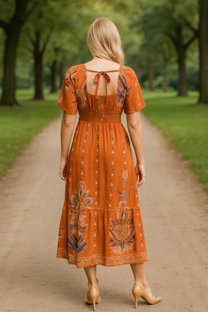 Vestido Midi Marrom com Estampa Étnica – Feminino e Charmoso