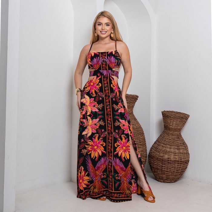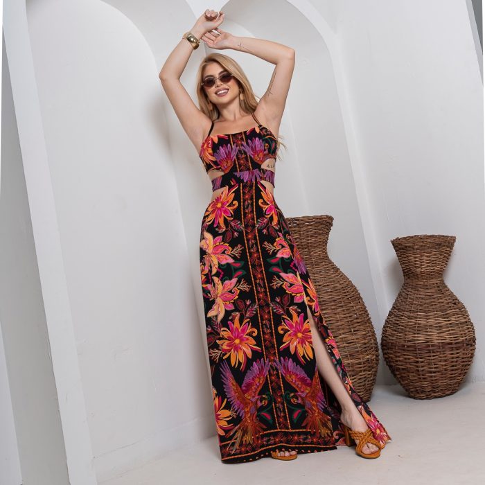 Vestido Longo com Recortes Laterais e Bojo – Estampa Floral Tropical