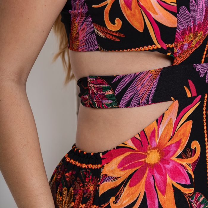 Com estampa floral vibrante e modelagem impecável, ele valoriza as curvas de forma sofisticada e moderna.