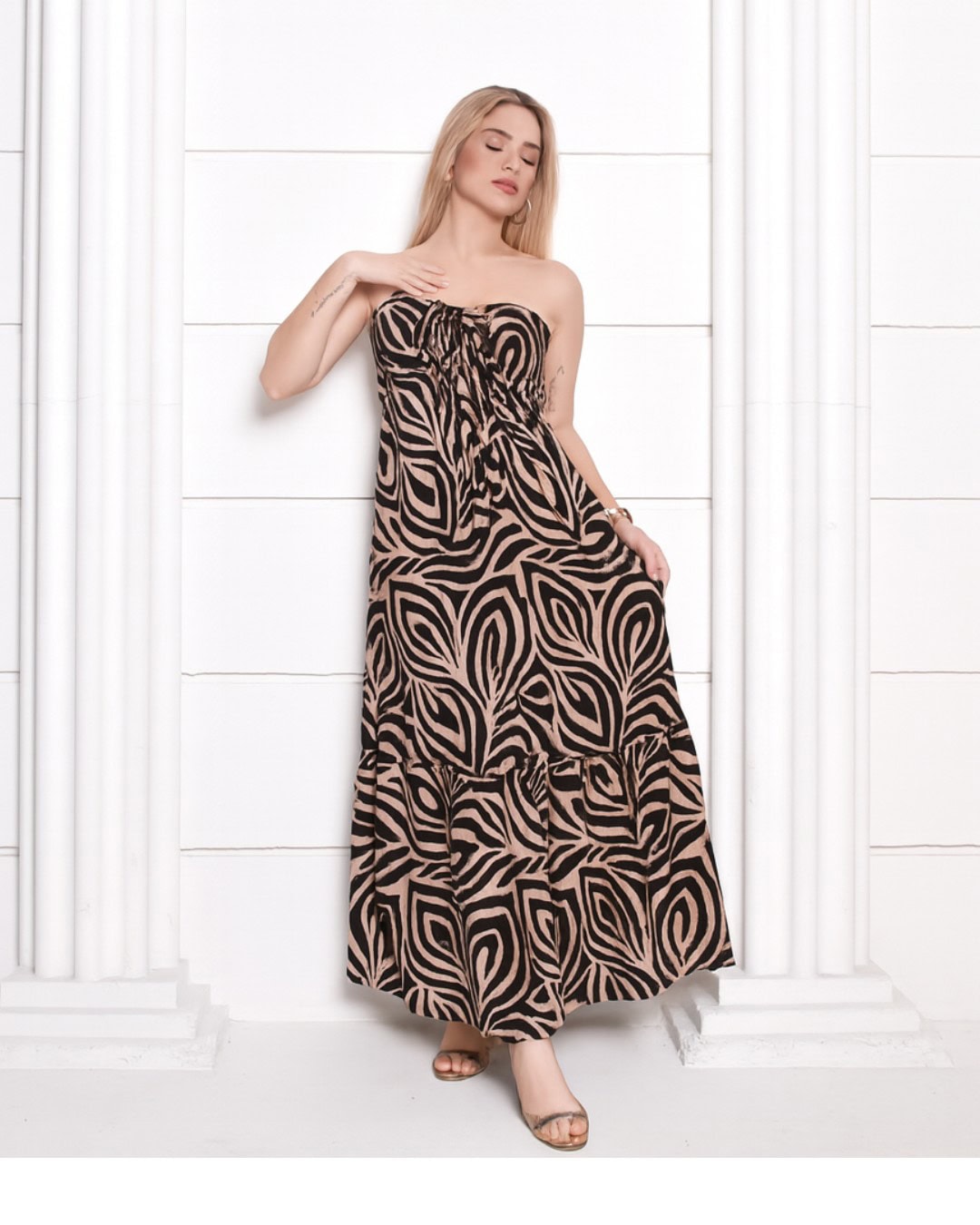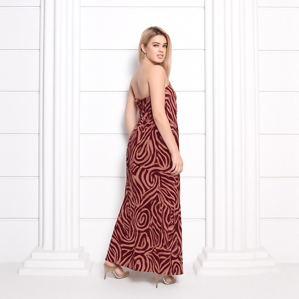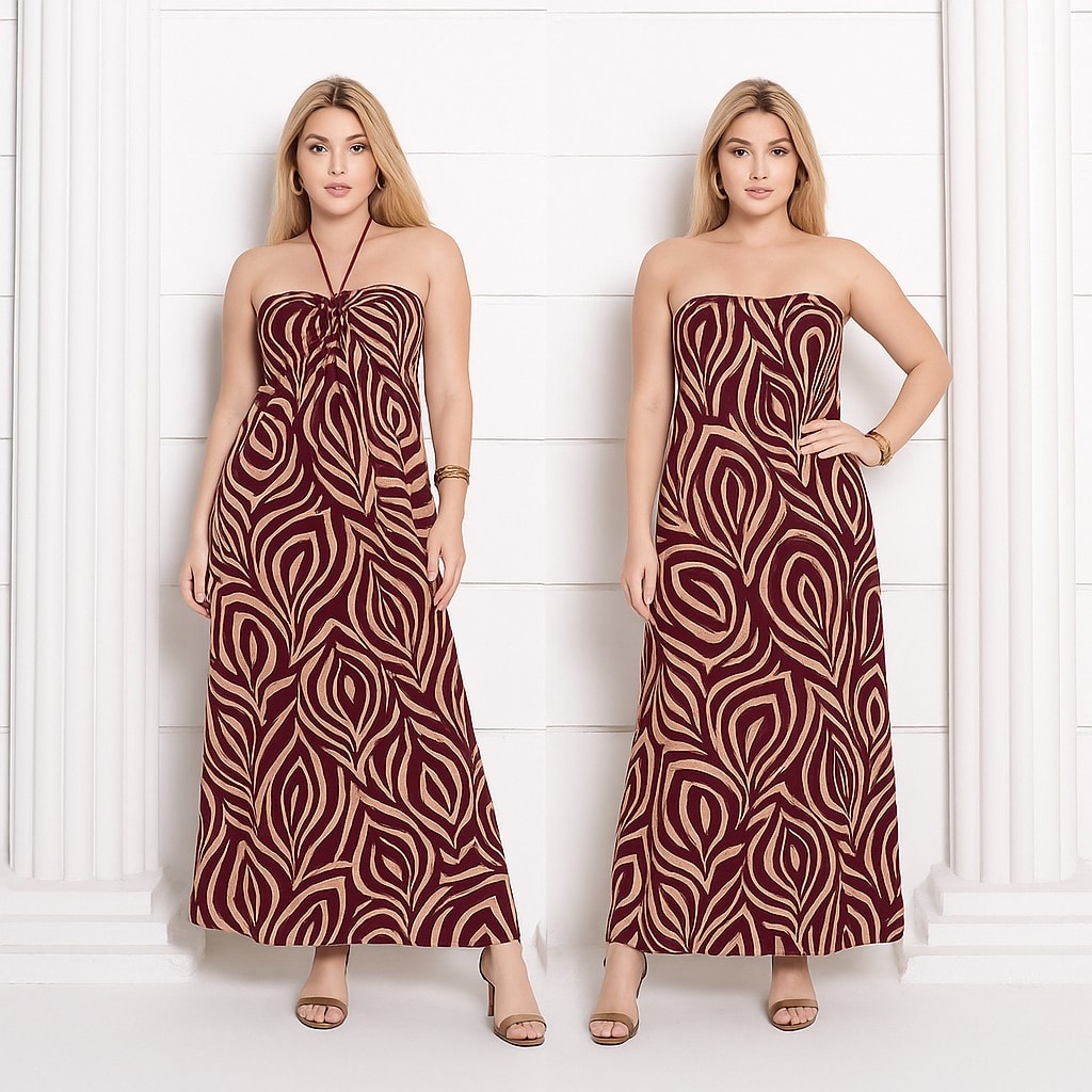 O vestido longo feminino estampado vinho e o marrom é perfeito para quem busca versatilidade, estilo e praticidade em uma única peça. Seu design inteligente permite usar o vestido de duas formas diferentes: com alça amarrada no pescoço estilo frente única ou como tomara que caia clássico, adaptando-se a diferentes ocasiões.